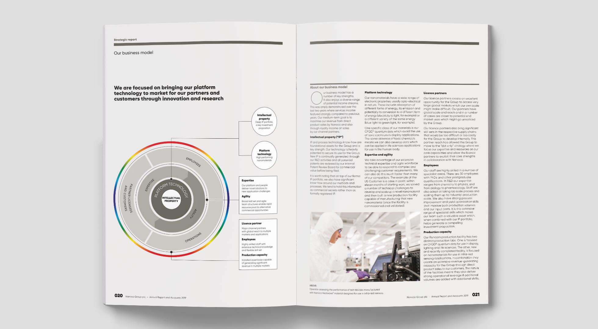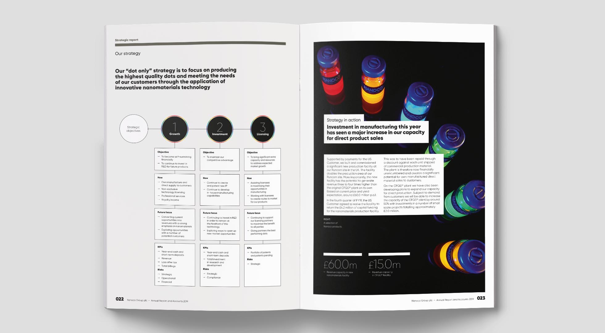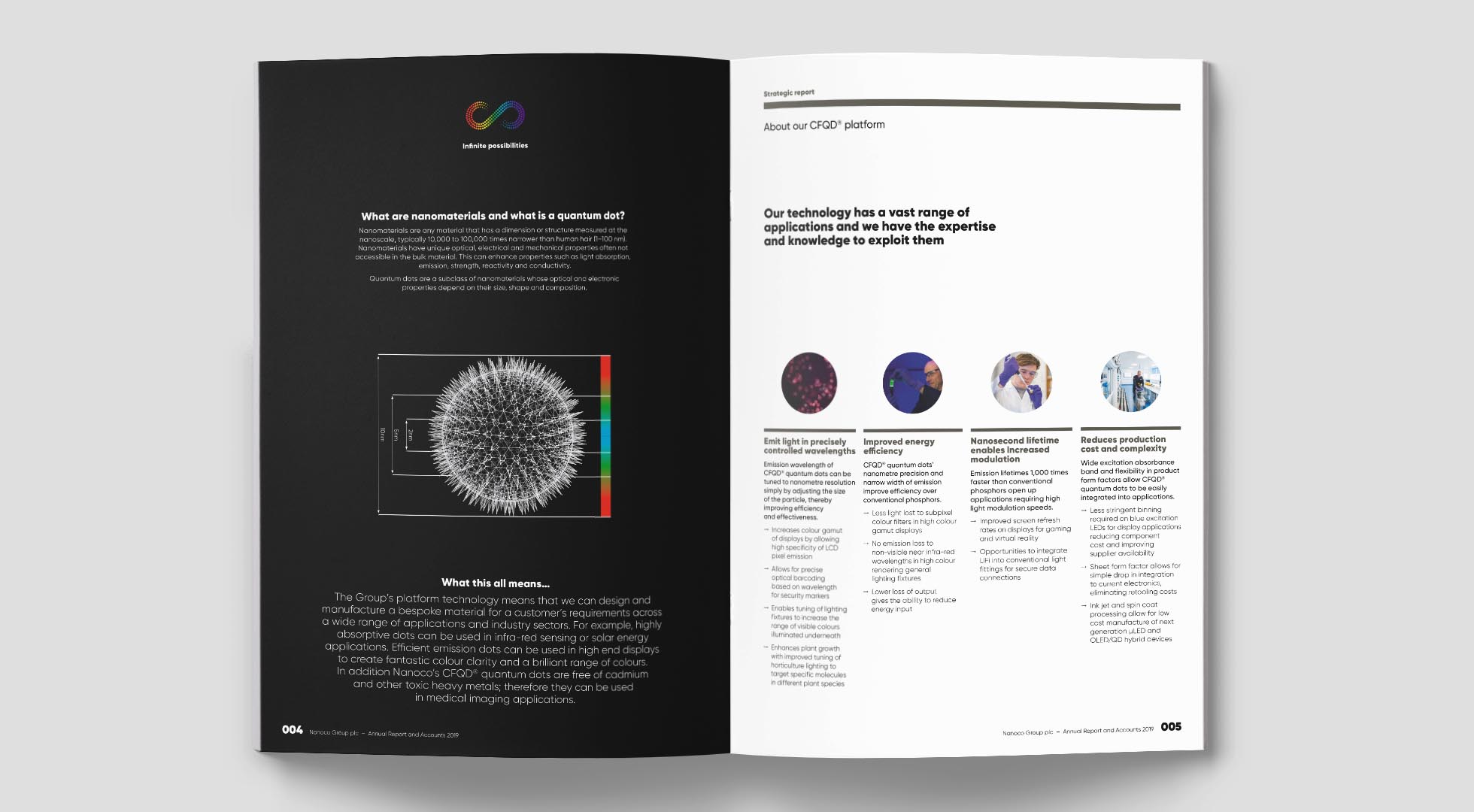 The feature spreads take a particular aspect of Nanoco’s technology platform and use diagrams to showcase the science, with a payoff in lay terms to explain the real-world advantage the technology creates.